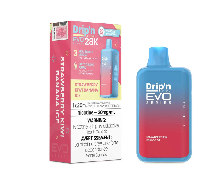 The Drip’n EVO 28K Strawberry Kiwi Banana Ice disposable vape seamlessly combines sophisticated flavor blending with advanced technological features. Its substantial e-liquid capacity, versatile power modes, and user-centric design elements make it a standout choice for vapers seeking a reliable and customizable device. The intricate fusion of strawberry, kiwi, banana, and menthol delivers a refreshing and layered taste experience that remains consistent throughout its lifespan.